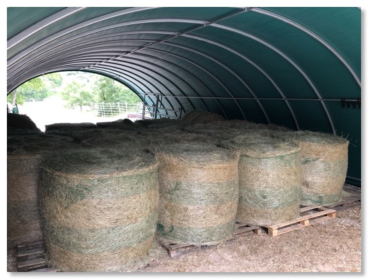 Jetzt haben wir in aller Ruhe 22 Rundballen (à je ca. 250kg) als Wintervorrat im grünen Zelt eingelagert.