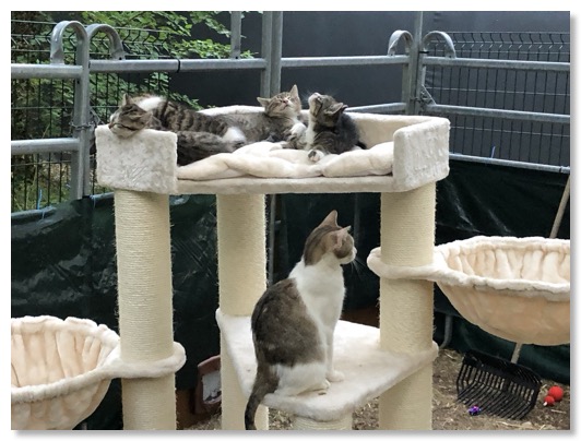 Sowohl der alle Kratzbaum in der Remise als auch der neue im Aussengehege erfreuen sich grosser Beliebtheit. Manchmal sind sie etwas "überbelegt" aber dafür schläft man halt sehr kuschelig.